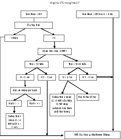 Cần hóa xạ trị. Nếu tuổi thai 20 – 22 tuần cần lấy thai ra (hysterotomy). Nếu thai > 22 tuần hóa xạ trị sau mổ lấy thai (trong khi mổ lượng giá hạch). Nếu sản phụ muốn dưỡng thai thì tiến hành hóa trị tân hỗ trợ. Cần giải thích rõ cho sản phụ : 1/ nguy cơ bệnh diễn tiến nhanh, 2/ chưa rõ ảnh hưởng của hóa trị trên thai.