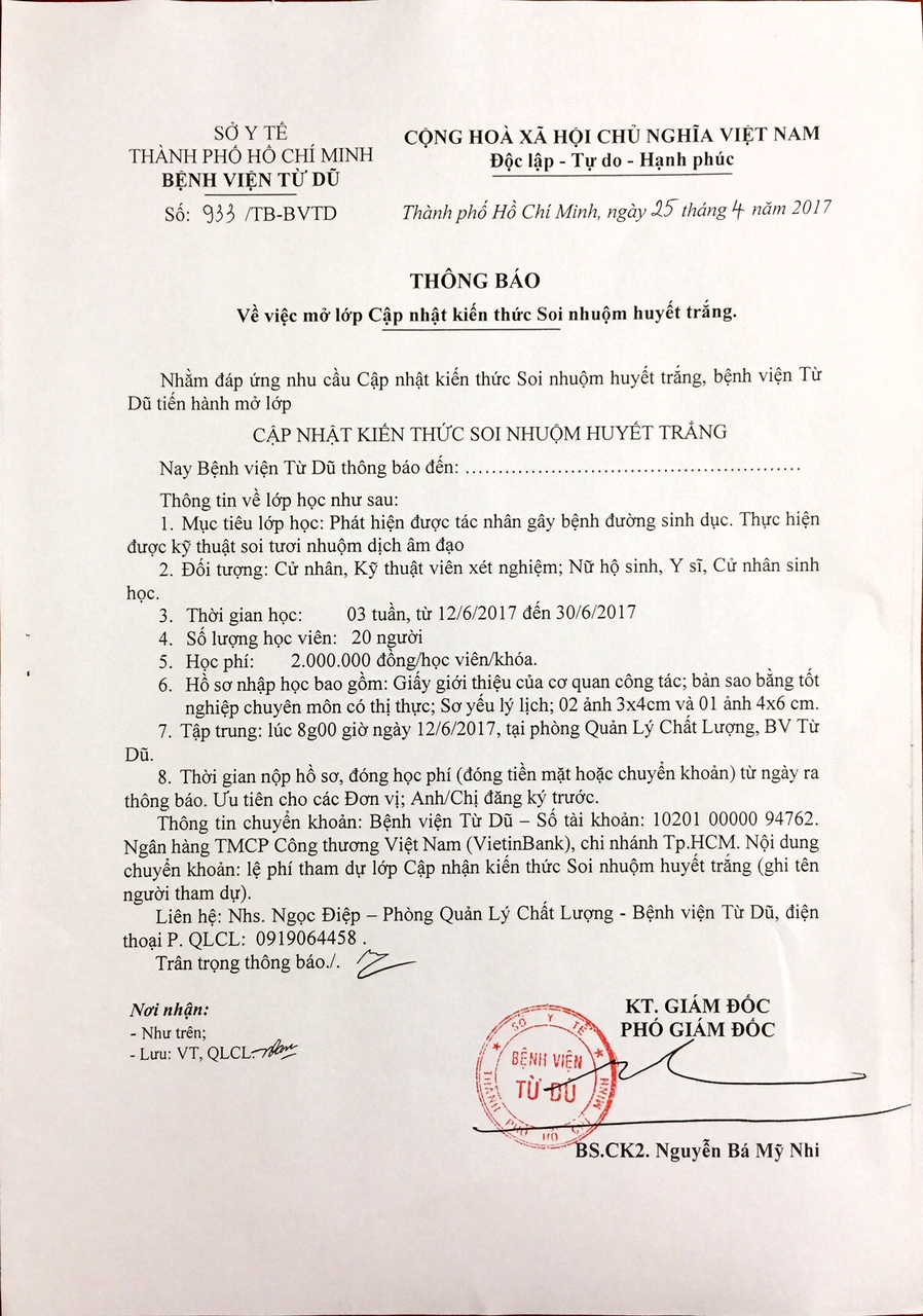 Thông tin chuyển khoản: Bệnh viện Từ Dũ – Số tài khoản: 113 00000 4919. Ngân hàng TMCP Công thương Việt Nam (VietinBank), chi nhánh Tp.HCM. Nội dung chuyển khoản: ghi rõ tên lớp học và Đơn vị chuyển khoản.