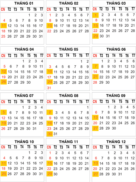 Thời gian: 08g00 vào sáng chủ nhật (tô màu vàng - xem lịch bên dưới)