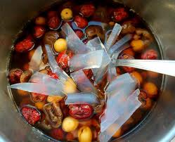 Nguyên liệu: 2 cái giò heo (phần chân dưới gối), 1 quả tim, hoa hòe 30g, gia vị: hành, gừng, muối, bột ngọt.